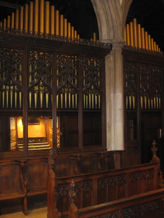 The organ stood facing west over the lower vestry, probably in the north chapel, until the spring of 1890, when it was turned through 90 degrees to a position similar to the present instrument. At the same time a Harmonic Flute to tenor c was substituted for the twelfth, a bearded gamba (to CC) for the three rank mixture, and all the reeds were re-voiced. These changes might by some be hardly regarded as improvements but were seen to be so at the time. The long backfall action to the swell was improved by substituting squares for backfalls and a tremulant was added to the swell.